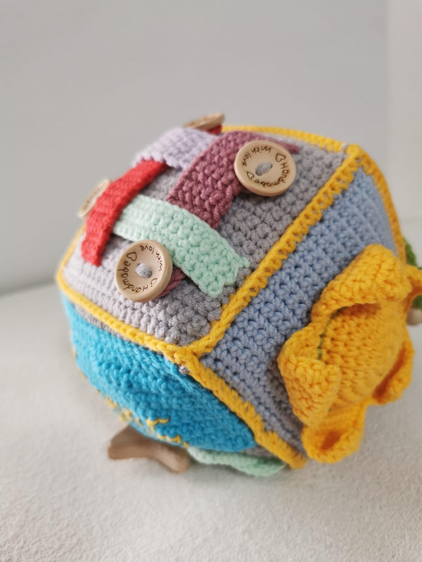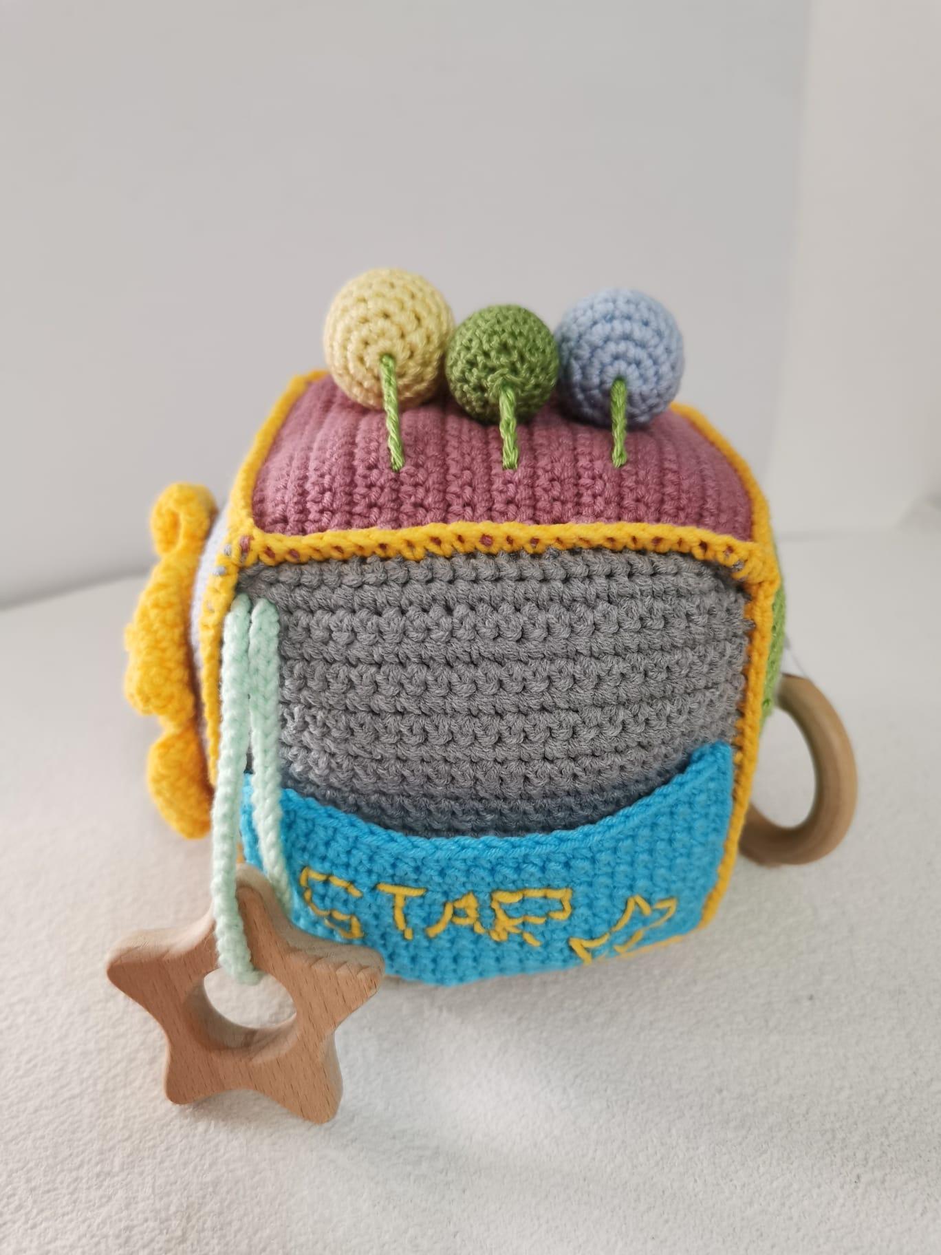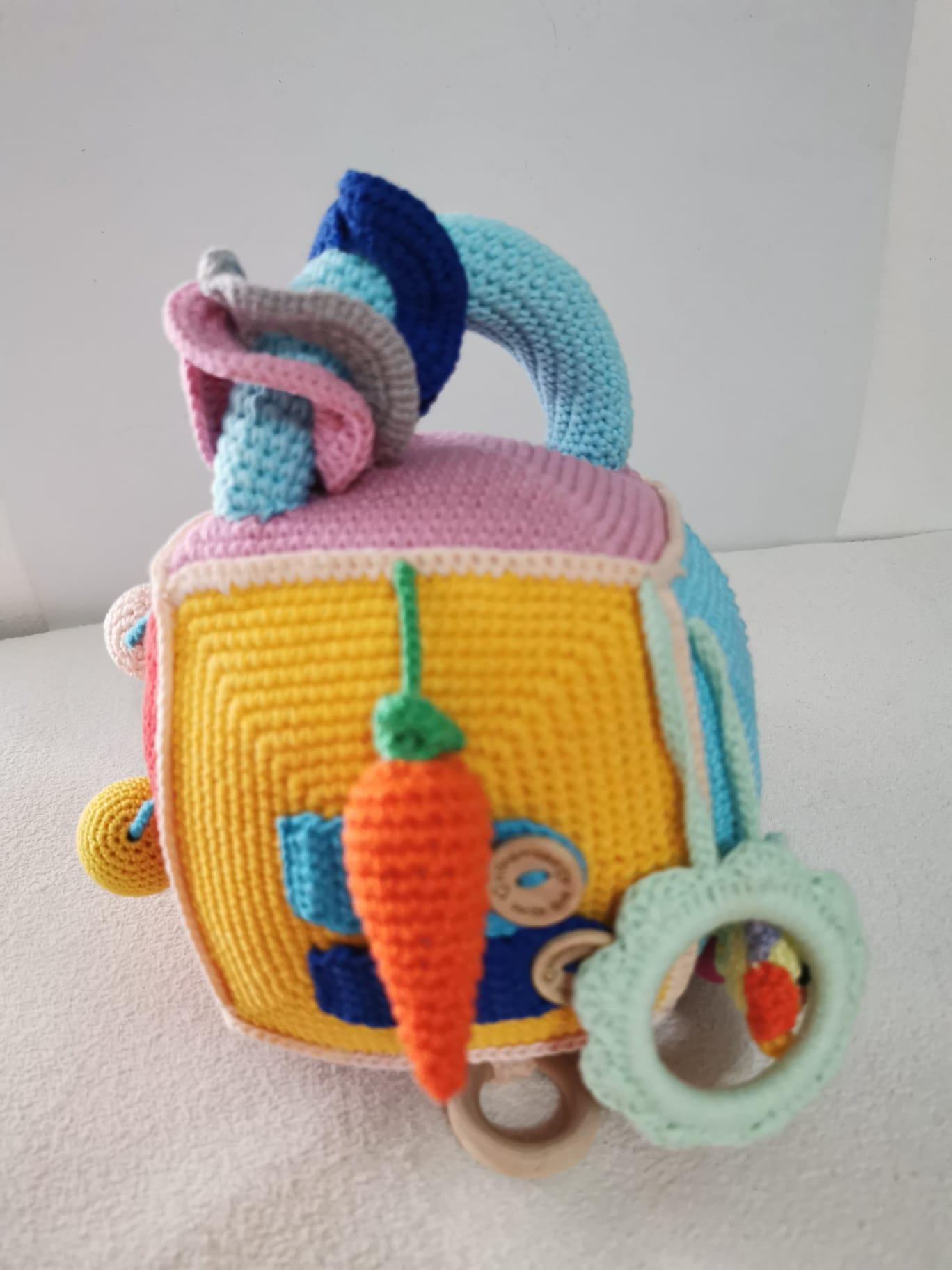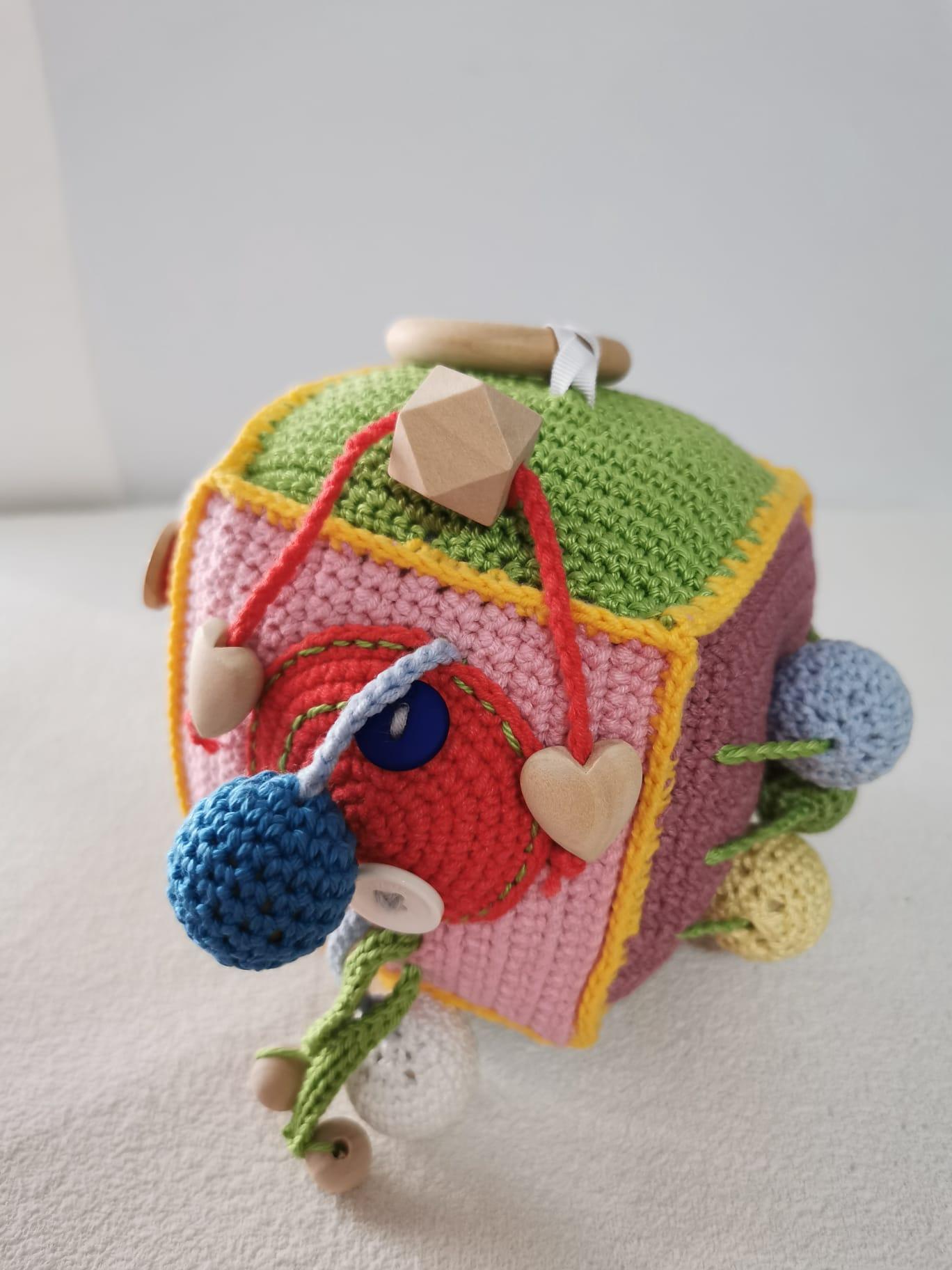 Cubo multisensoriale Montessori, perfetto per lo sviluppo sensoriale e intellettivo del bambino. 6 facce con giochini vari per stimolare la fantasia e il ragionamento. Realizzato in cotone anallergico specifico per bambini neonati.